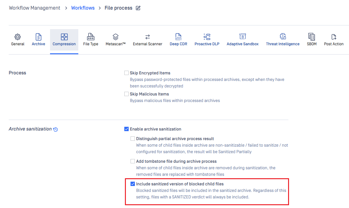 To make configuration more intuitive, the “Include sanitized version of blocked child files” option has been moved from the Deep CDR tab to the Compression tab. This update helps users find and manage this setting where it makes the most sense, without changing any underlying functionality.