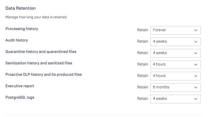 Changed the Data Retention "Off" option label to a clearer term to avoid confusion. The previous "Off" label under the "Data retention" section was misleading; it now displays as "Retain: Forever" to better indicate the actual behavior.