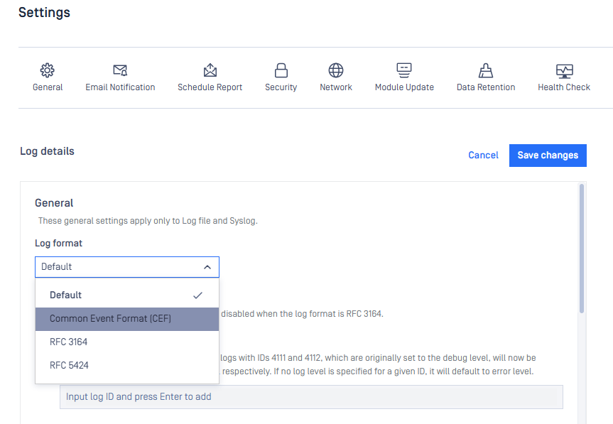 The application now allows selecting the syslog message format used for CEF output to integrate with different SIEM systems without breaking existing deployments. Supported formats include: Default, CEF, RFC 3164, and RFC 5424.
