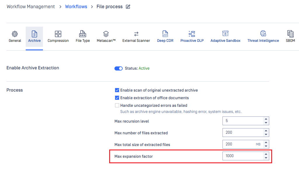 By default, the system uses a high threshold (1000:1), so existing customers won’t be affected unless they choose to tighten the setting. If an archive exceeds the configured value, it’s now blocked with a new verdict: Exceeded Archive Expansion Factor.