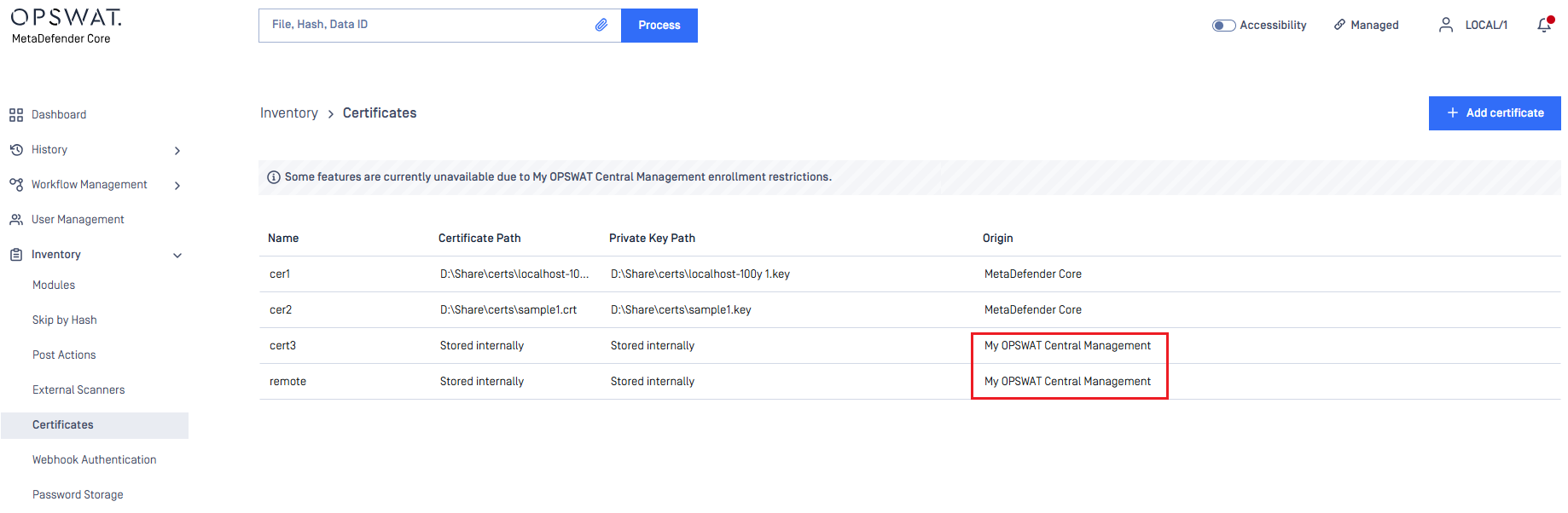 MetaDefender Core is able to automatically synchronize certificates with My OPSWAT Central Management (MOCM), supporting both Standalone and Shared DB modes, and prevents accidental deletion or modification of synchronized certificates.