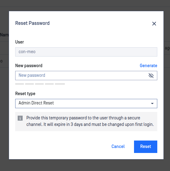 With a new option, MetaDefender Core allows administrators to generate a temporary password and securely share it with users through alternative channels. The feature clearly instructs admins on next steps, and the temporary password will expire in 3 days, requiring a change upon first login.