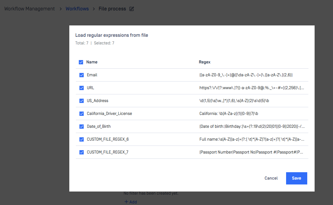 - The “Pick regexes” pop-up model is not yet supported in My OPSWAT Central Management. Instead, you can provide the path to the TSV file in the MetaDefender Core workflow configuration on the My OPSWAT Central Management console. By default, all regexes in the TSV file are selected, and you can edit the TSV to remove existing regexes or add new ones.