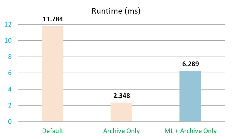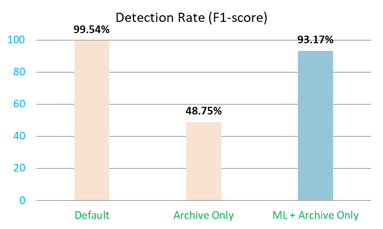 Below are comparisons of run time and detection rate across three modes: Default, Archive Only, and ML + Archive Only. ML stands for Machine Learning which requires feature Classify with Machine Learning to be enabled. The test results are for reference only and were obtained using a dataset in which approximately 55% of the files were archive files. Actual results may vary depending on file types and nature of files.