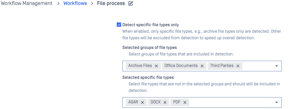 - At Workflow Management > Workflows > [Workflow name] > File Type > General, Enable Detect specific file types only