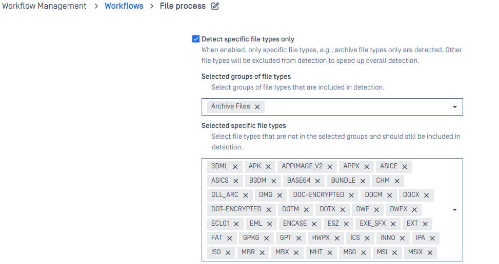 There are also non-archive files that are still extractable, for example, MS Office, disk images... If these are applicable to your use case, they should be added in the Selected specific file types section. You do not need to enable all options; only select the file types relevant to your use case.