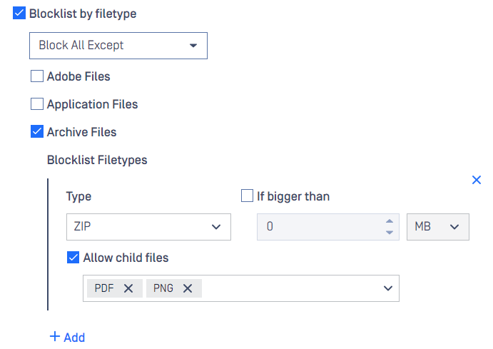 | Blocklist All Except treats child file types in separate ways | For Archive Files under Block-All-Except, there is an ability to further process predefined child file types and instantly block other child file types. For example, PDF and PNG child files of ZIP file will be processed, meanwhile, other file types else will be blocklisted.