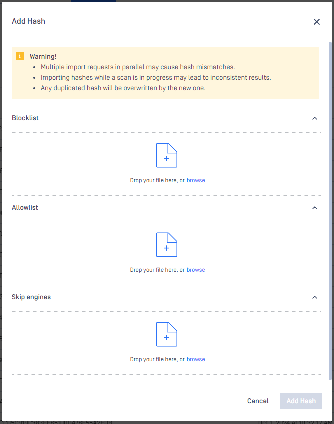 | CSV upload for feature Skip-by-Hash | Users can now upload CSV files to the "Skip by Hash" list including “Skip Engines”, “Allowlist” and “Blocklist”. It allows users to improve scanning efficiency by focusing resources on potentially harmful files instead of known safe entities.