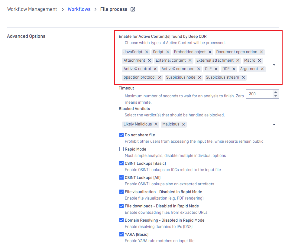 | Selective analysis of files containing specific Active Content(s) with Adaptive Sandbox engine | Giving users more flexibility to analyze their own files with Adaptive Sandbox. With this setting, only files containing specific Active Content(s) will be analyzed by Adaptive Sandbox engine.