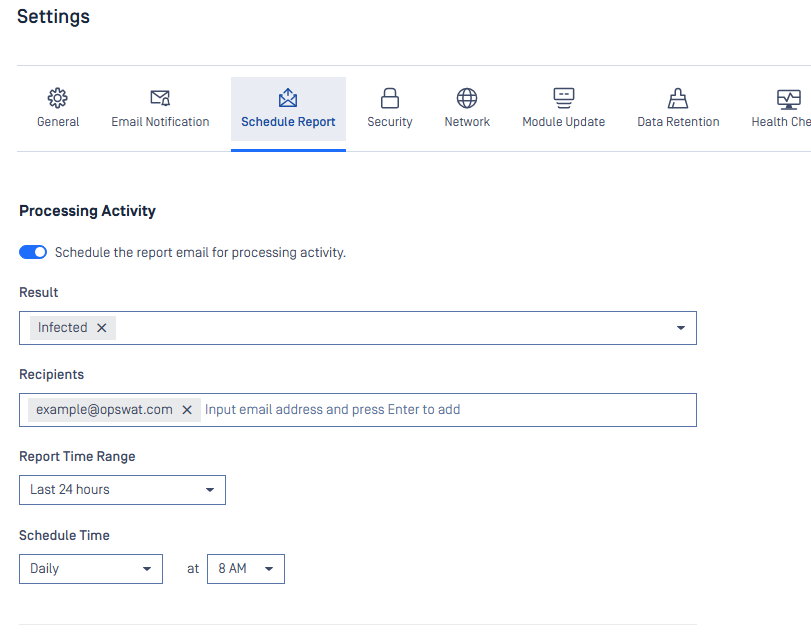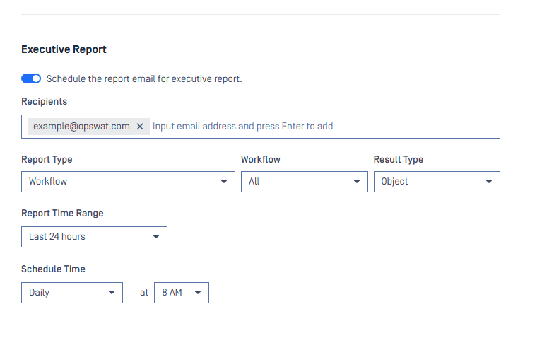 | Report scheduling | MetaDefender Core provides a new feature that enables Administrators to schedule not only when executive report and processing history report are sent but also set recurring schedules for automated delivery. This feature goes with abilities to specify email recipients, apply filters to tailor the data and define precise time range.