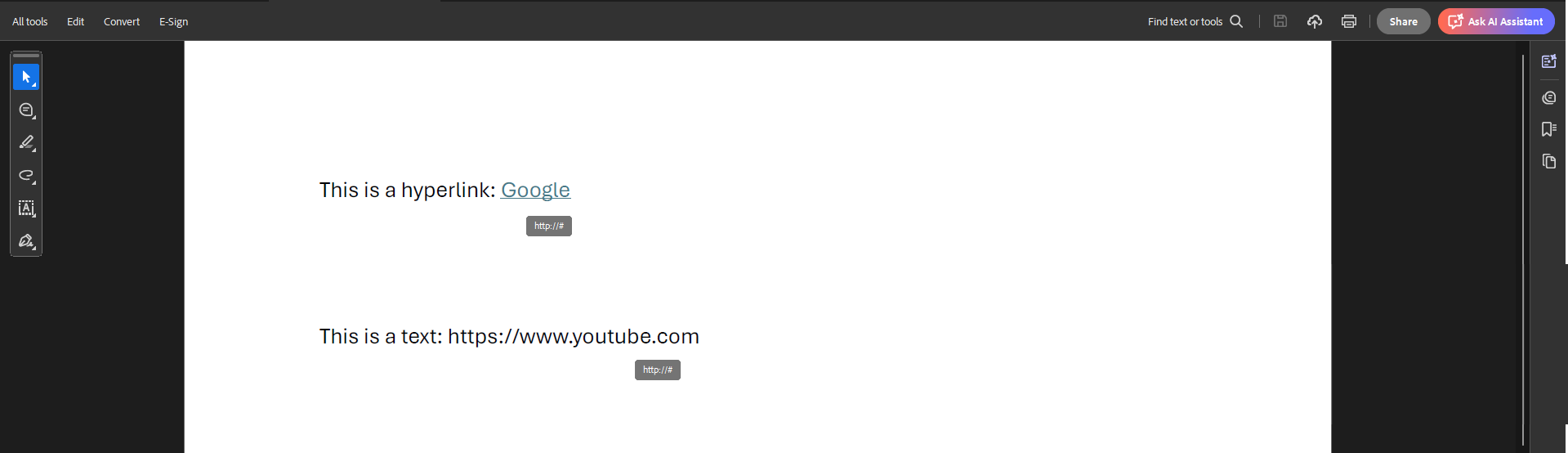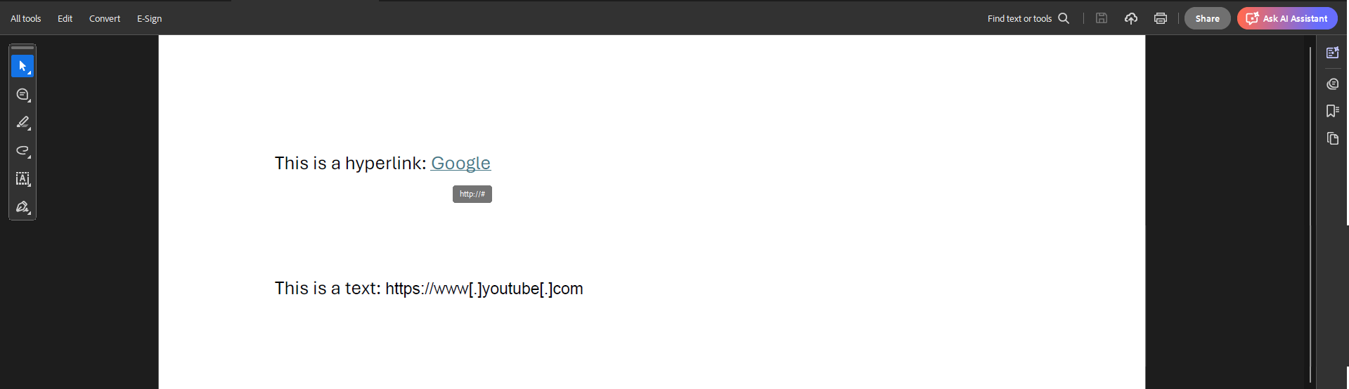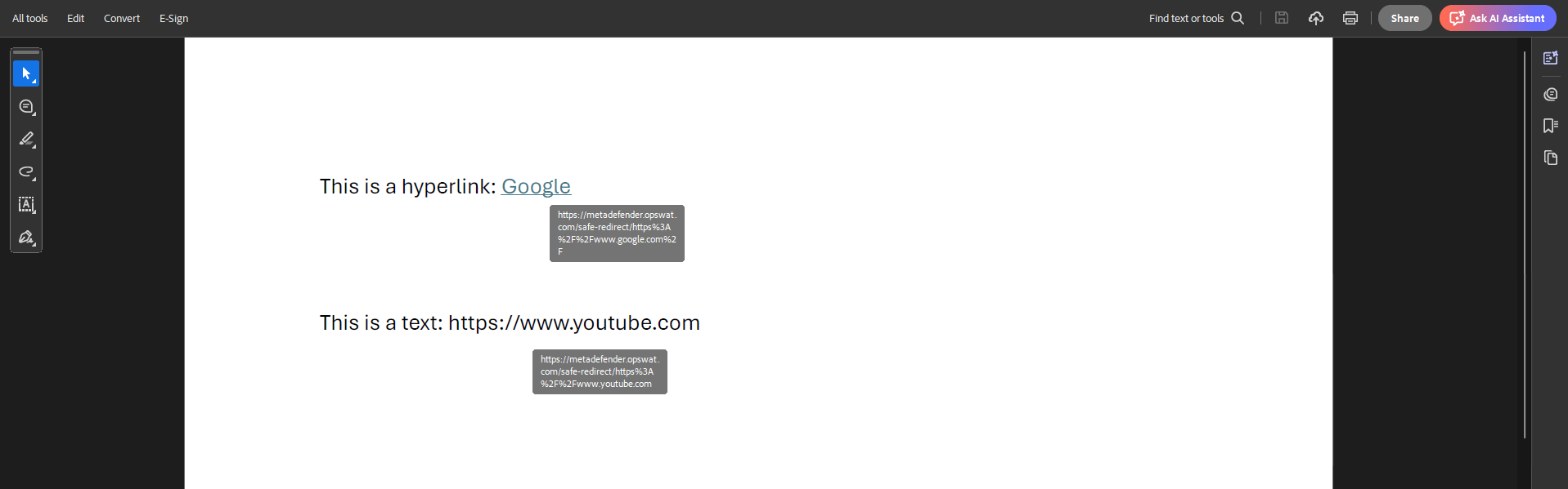 • Remove hyperlink annotations and text links: Remove hyperlink annotations and replace text links with null links (http://#). Text links will not be clickable.