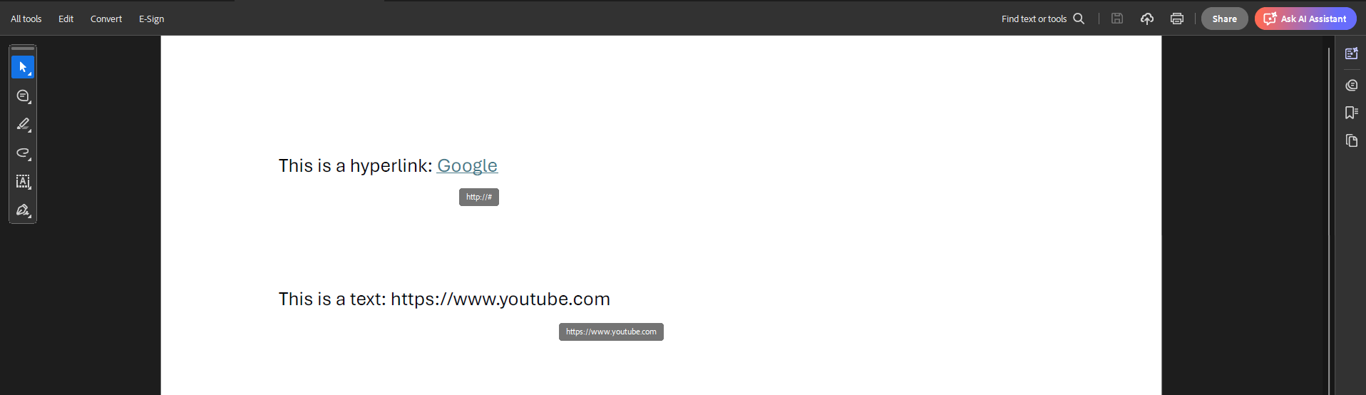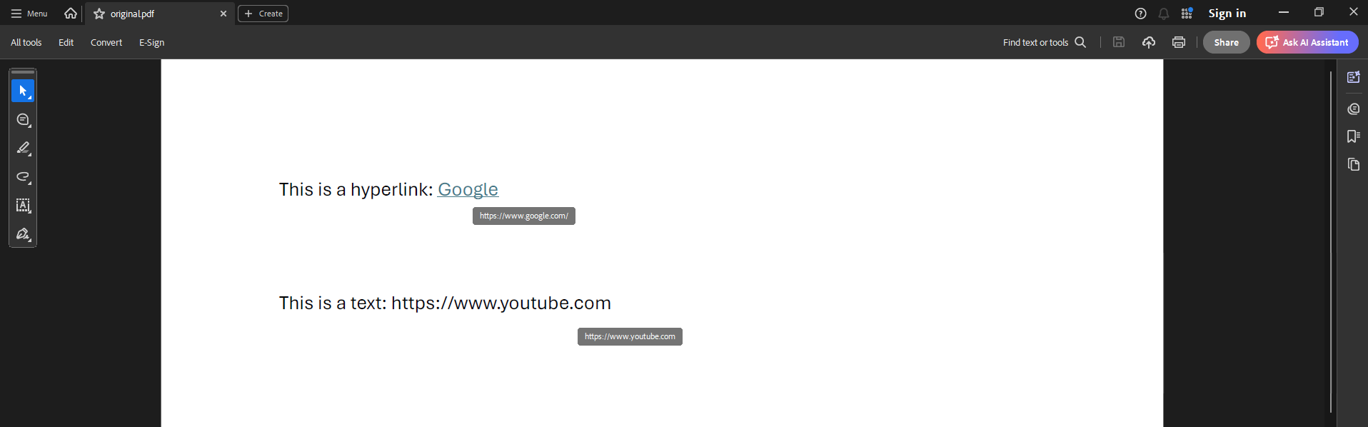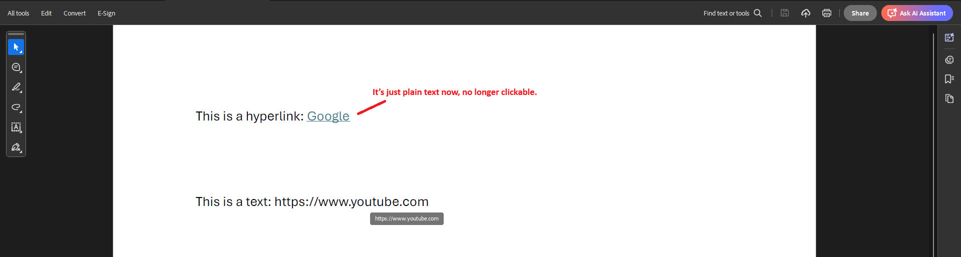 • Remove hyperlink annotations and text links: Remove hyperlink annotations and replace text links with null links (http://#). Text links will not be clickable.