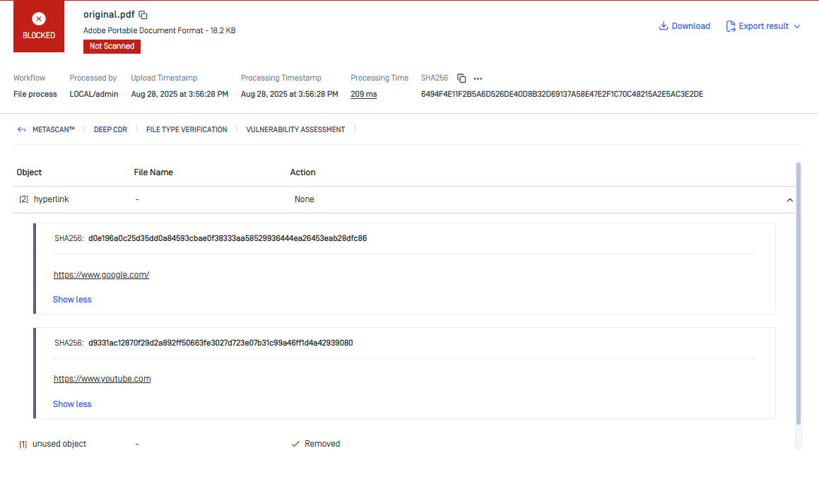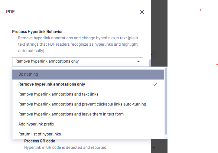 On this page, we will describe the configuration of Process Hyperlink Behavior for PDF files and provide examples for each option. This configuration allows users to remove hyperlink annotations and change hyperlinks in text (plain text strings that PDF readers recognize as hyperlinks and highlight automatically).
