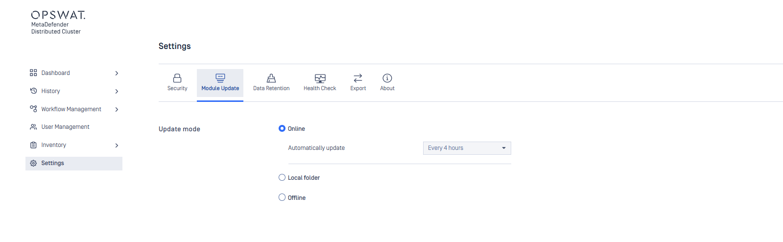 MetaDefender Distributed Cluster (MDDC) introduces three modes of Module Update. To switch between the modes, please sign in to MDDC Control Center console, navigate to Settings and select Module Update tab.