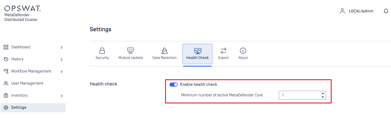 System administrators can enable the health check option and set the minimum number of required MetaDefender Core instances in the Health Check settings of the MDDC Control Center.