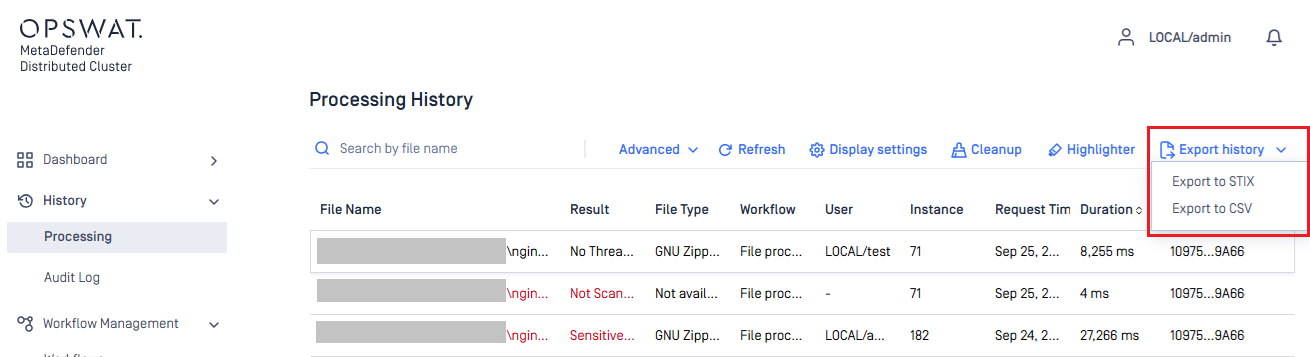 Processing history can be exported in STIX or CSV format from MDDC Control Center.