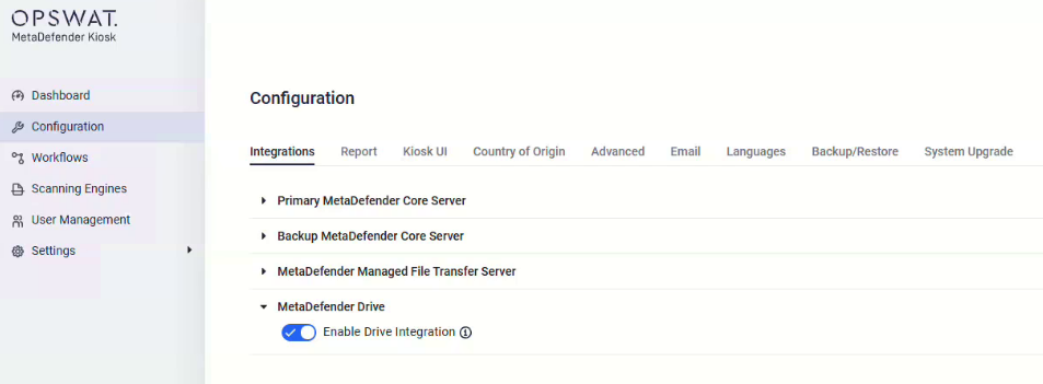 - In MetaDefender Kiosk, go to server config page --> Configuration --> Integrations