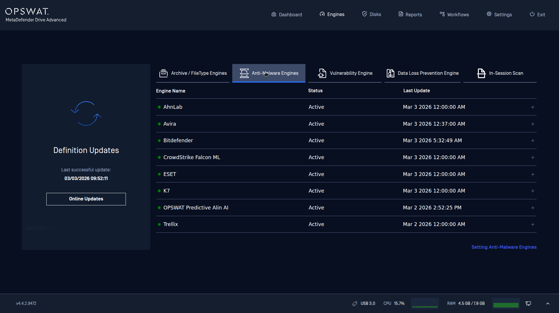 - MetaDefender Drive will automatically update the engines if an active internet connection is enabled.