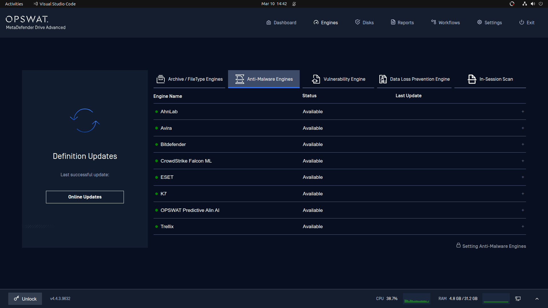 - It is highly recommended that you update your engines regularly via an online connection, from OPSWAT Central Management or using the Update Downloader tool for Offline Environment.