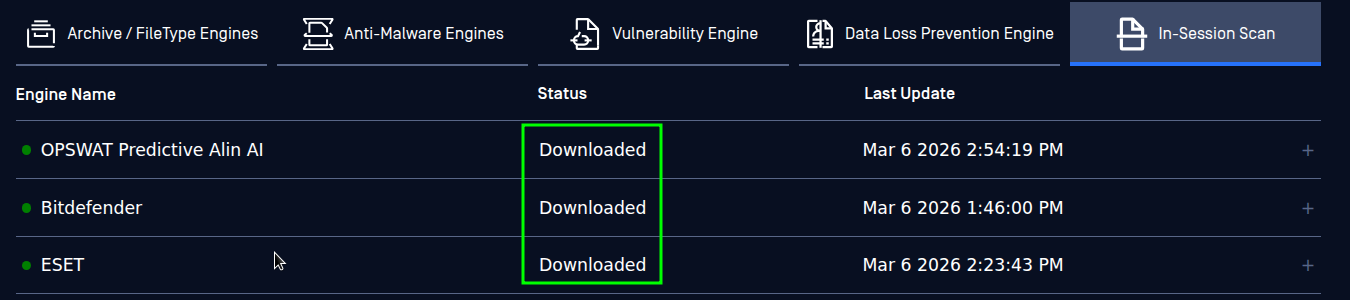 Engines for In-Session Scanner are also downloaded together with other engines for MetaDefender Drive. You can see them in the different tab names: "In-Session Scan".