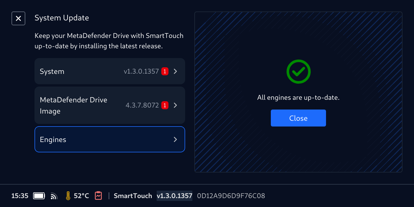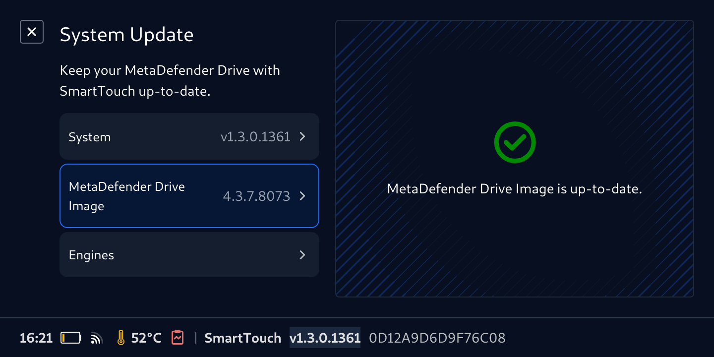 Despite MetaDefender Drive shipping with the latest software version, it is always a good practice to check for updates before use.