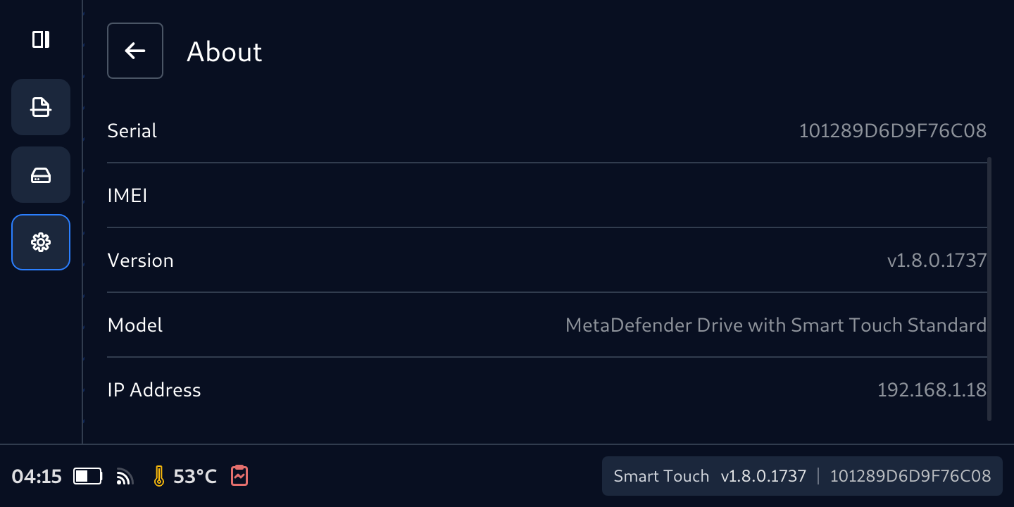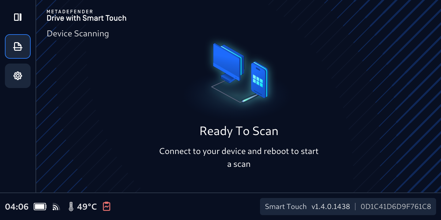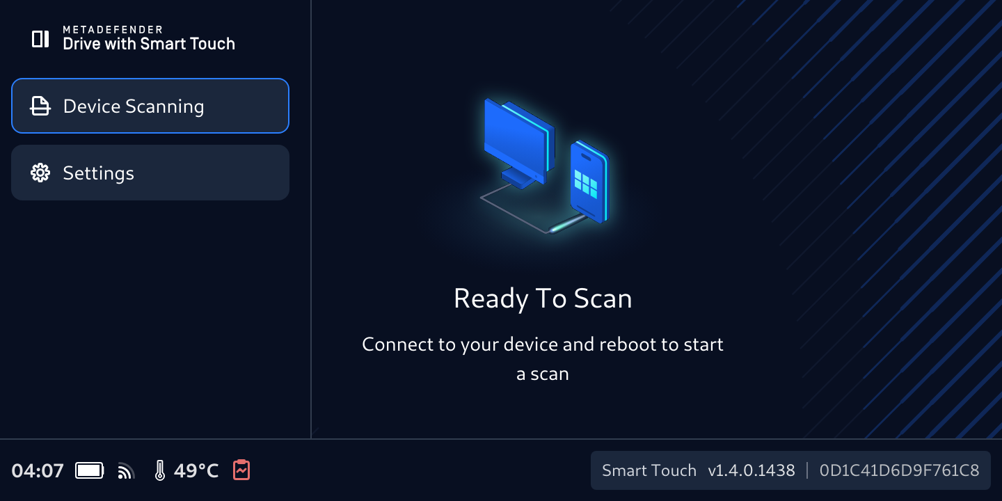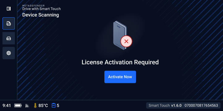 MetaDefender Drive with Smart Touch features a mobile form factor to add more flexibility and connectivity to transient device scanning. Similar to other form factors, it ships as an out-of-the-box solution with the latest software and scanning engine versions installed.