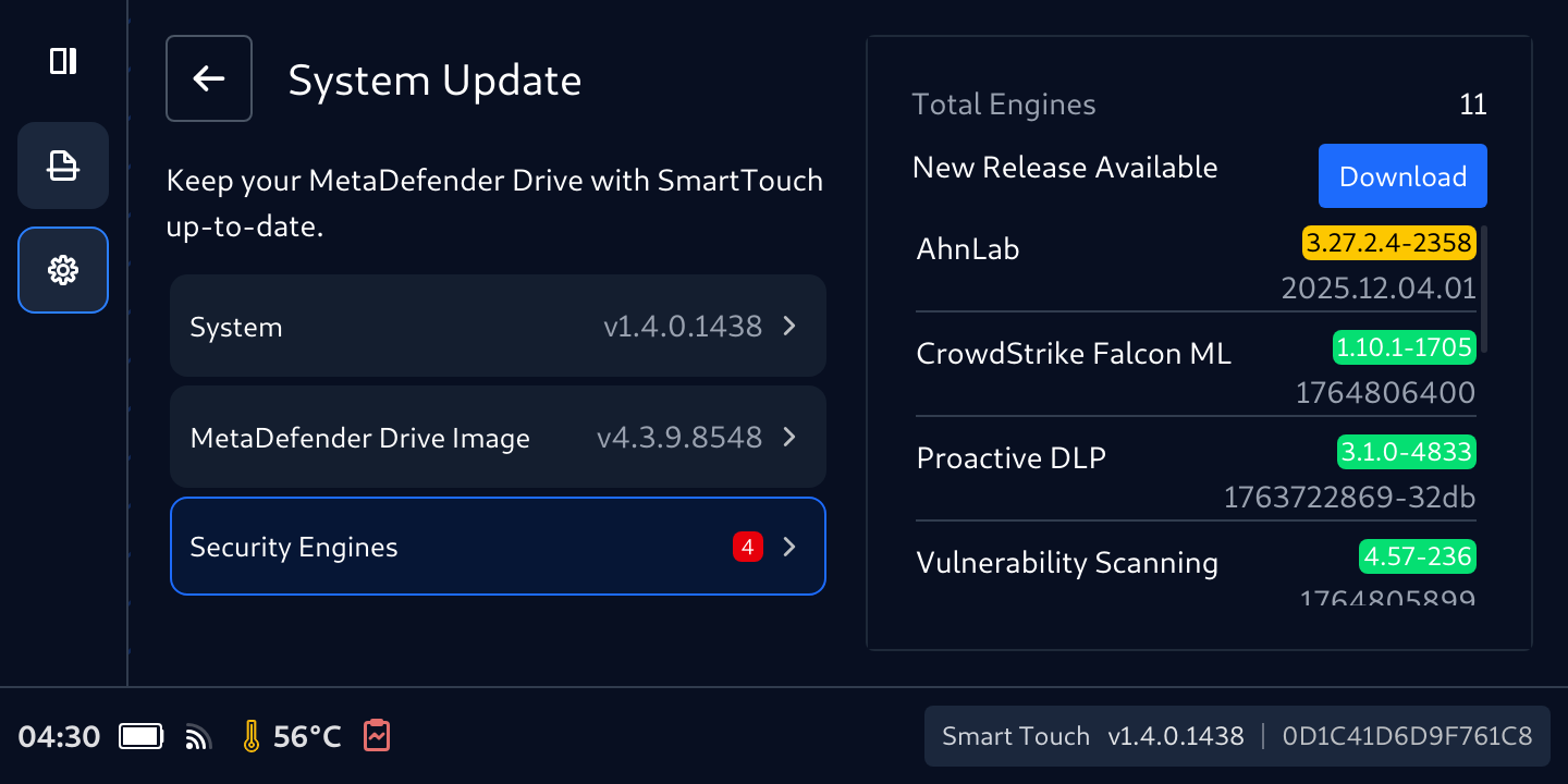 - Select System Update screen, noticing that there are updates available, tap System, MetaDefender Drive Image, or Engines, then tap Download or Install, and wait for the new version of the application to be downloaded.