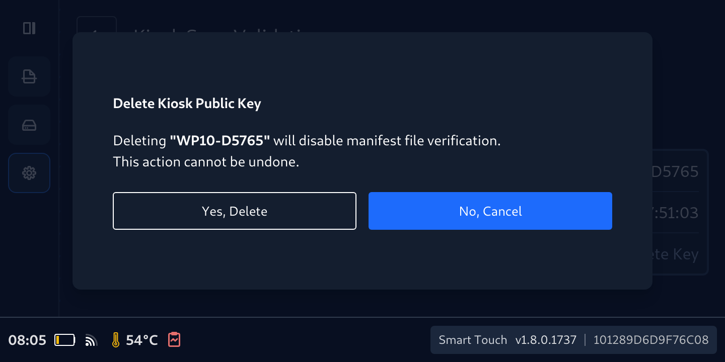 - To confirm deletion, tap Yes, Delete on the Delete Kiosk Public Key popup