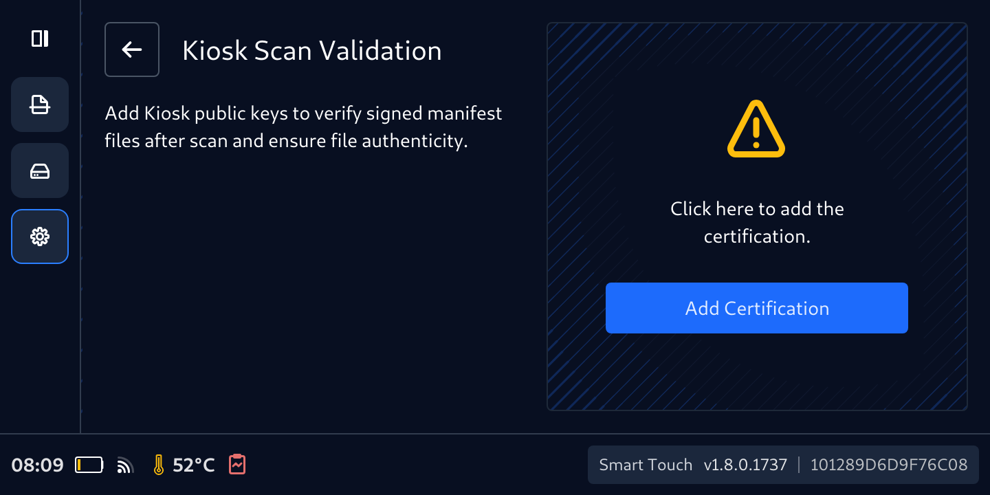 To use Secure Storage with Kiosk, follow the steps to add the valid key, on a Secure Storage that does not currently have a public key