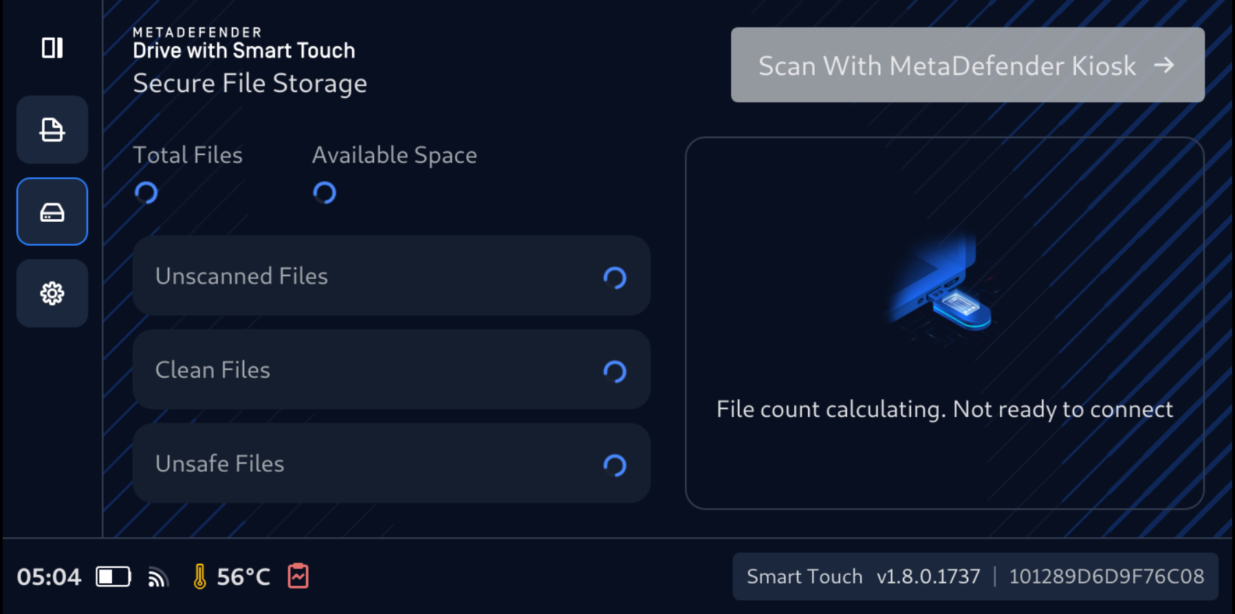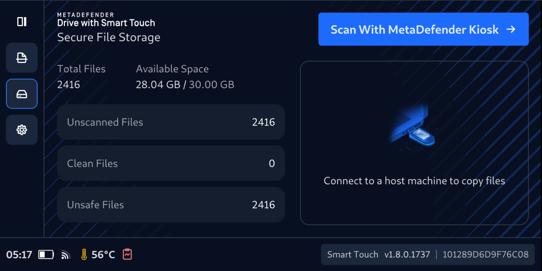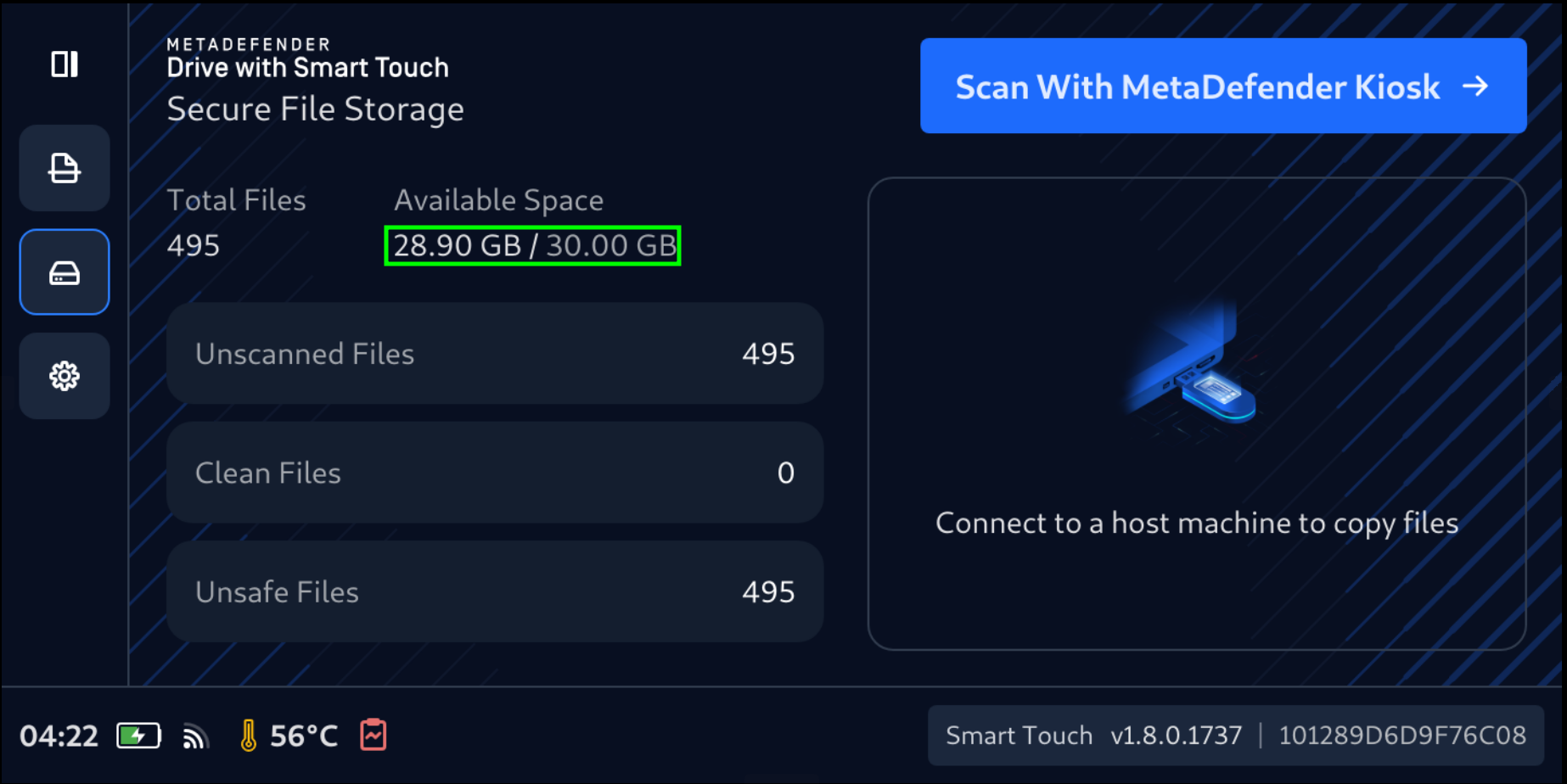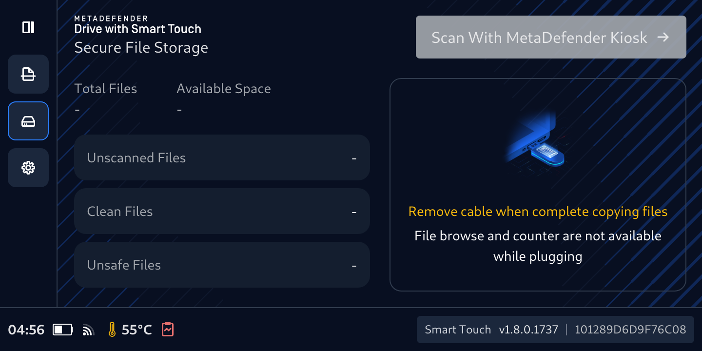 - Once the initialization is complete and the Connect to a host machine to copy files message is diplayed on the MetaDefender Drive with Smart Touch screen, Secure File Storage is ready.
