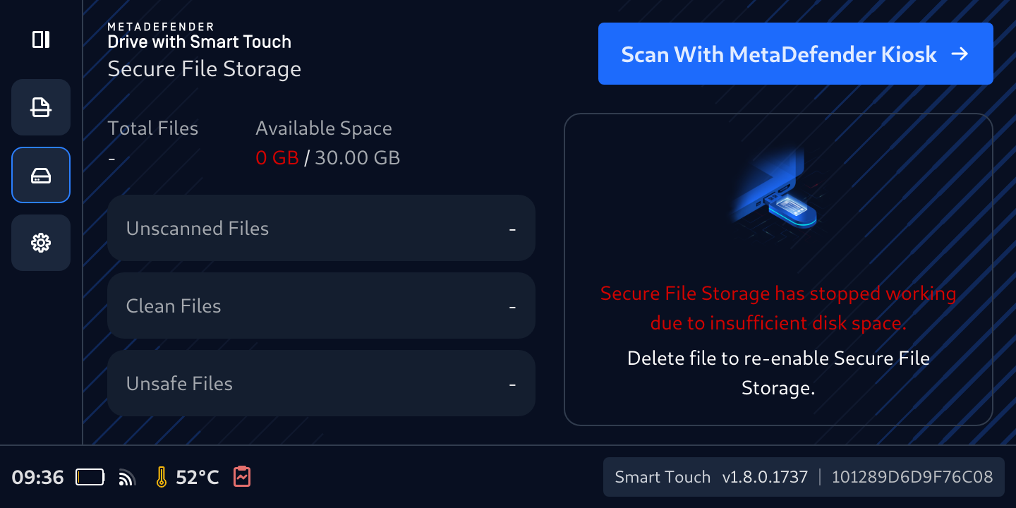 Secure File Storage enables using MetaDefender with Smart Touch to securely transfer files across isolated zones, by securing storing files and making them inaccessible until they are scanned by a MetaDefender Kiosk.
