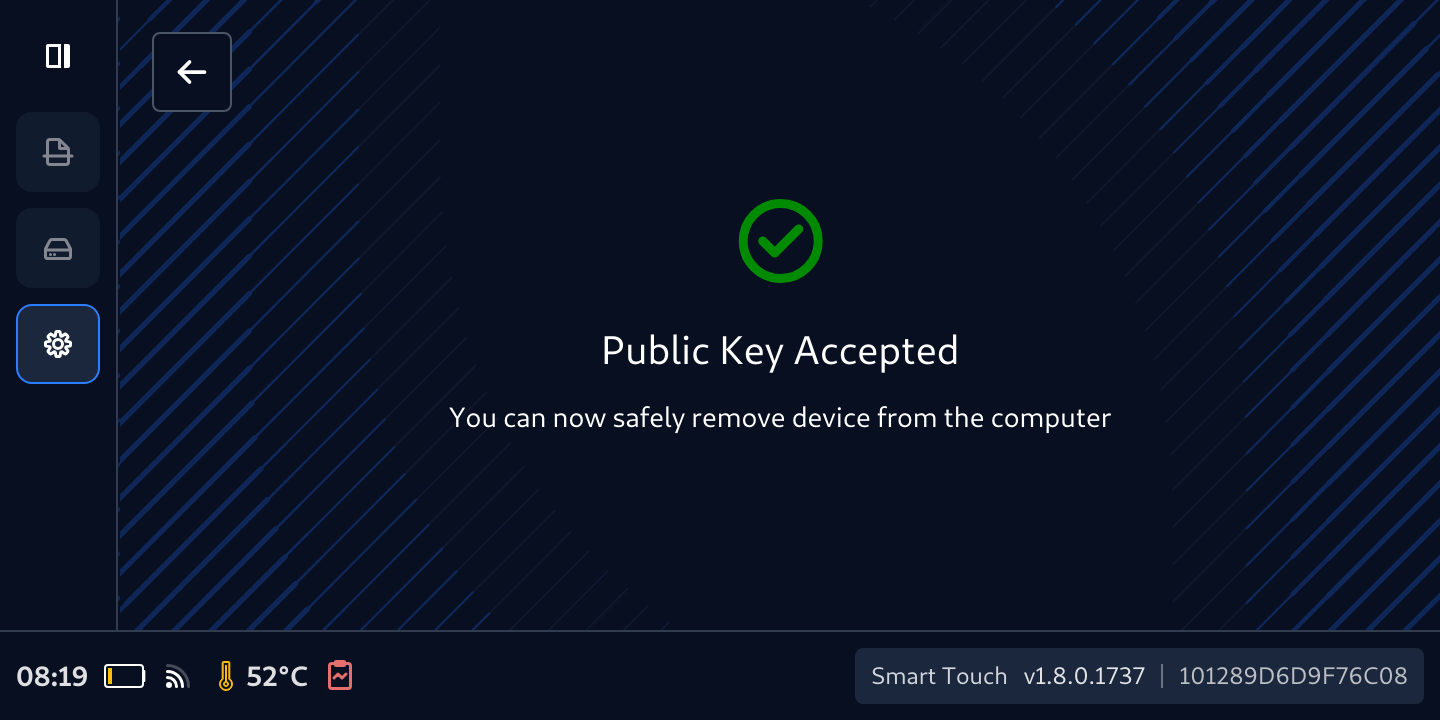 - Don't remove the cable, wait for the key to be accepted when this screen appears