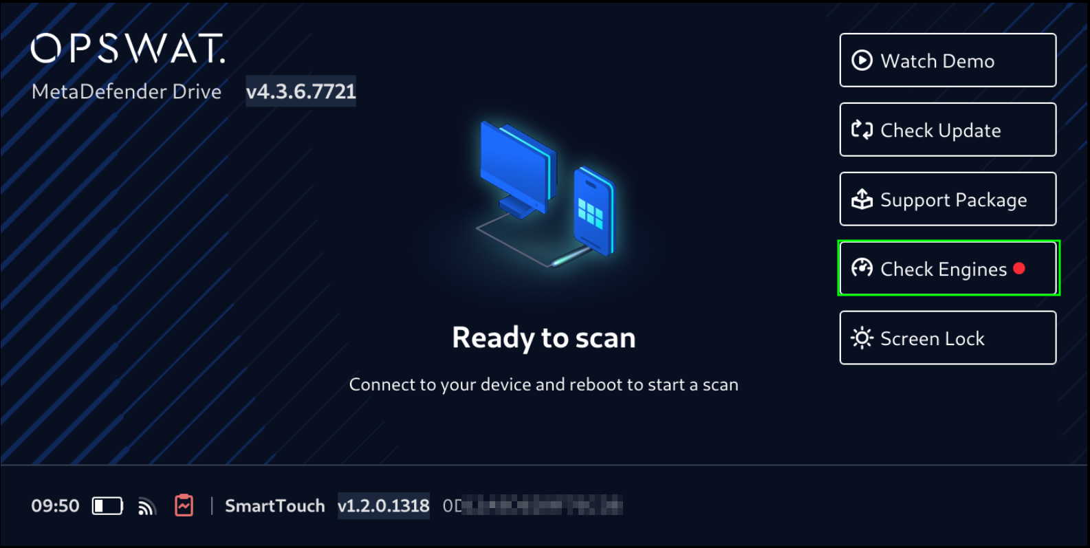 MetaDefender Drive with Smart Touch regularly checks for new engines updates and alerts the user through the Check Engines button when updates are available.