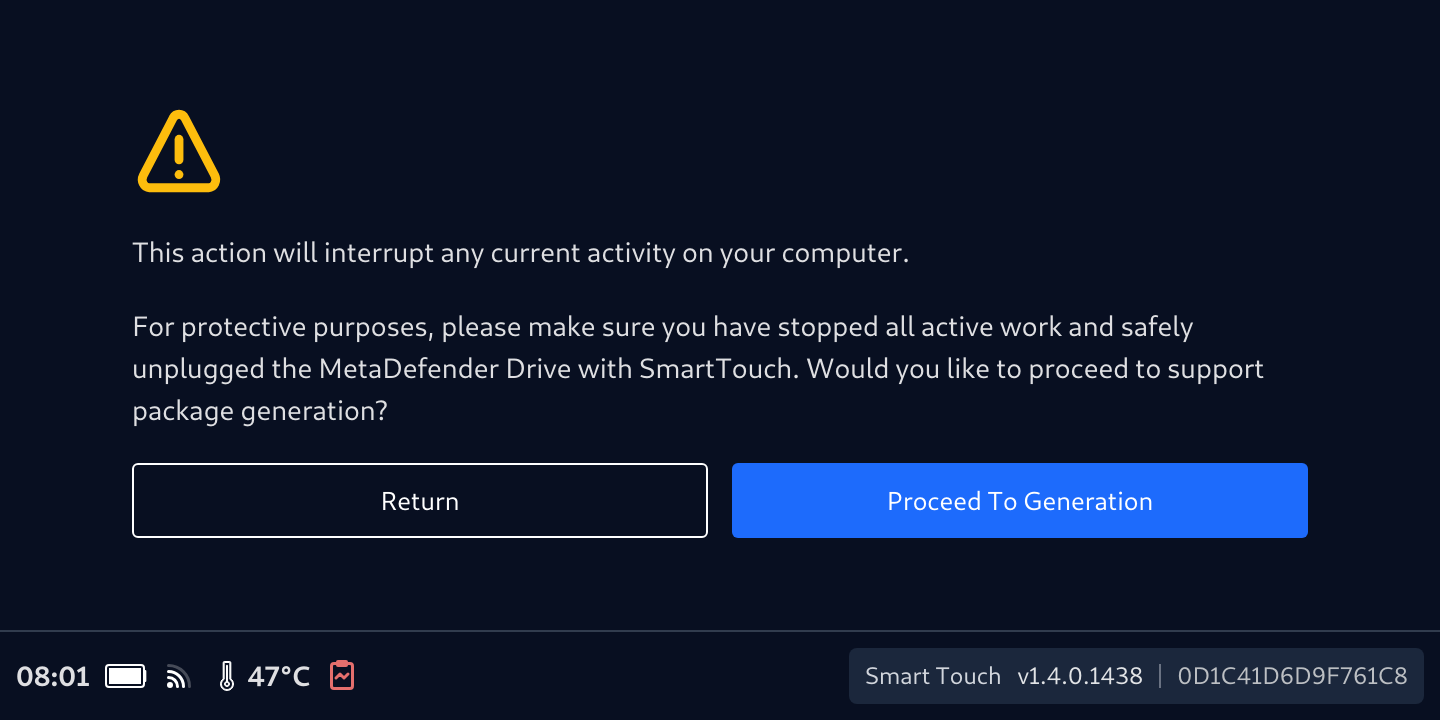 To generate a support package for MetaDefender Drive with Smart Touch, ensure your drive is not connected to a target device or performing any operations.