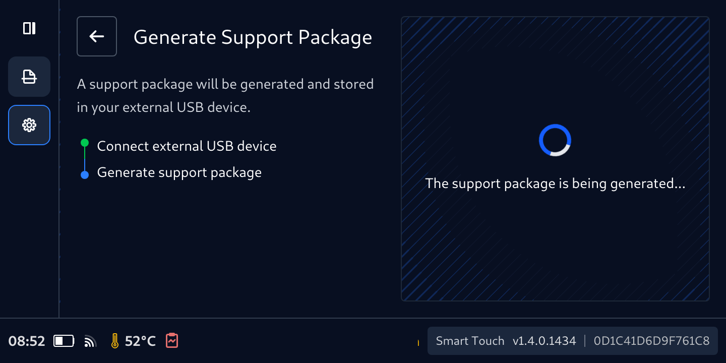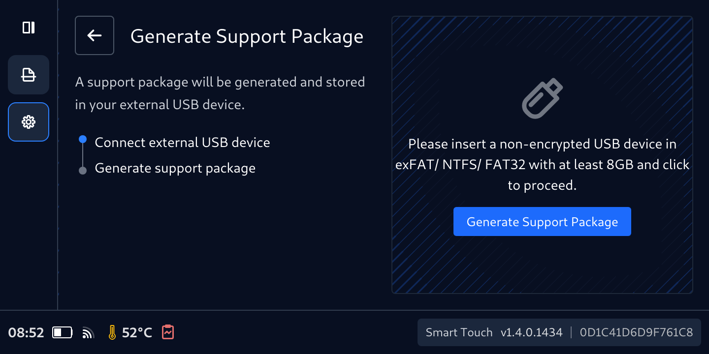 1. Prepare an external USB (formatted in NTFS/FAT/exFAT) with USB-A-to-C adaptor. Insert it into the type C port of MetaDefender Drive with Smart Touch then tab Generate Support Package