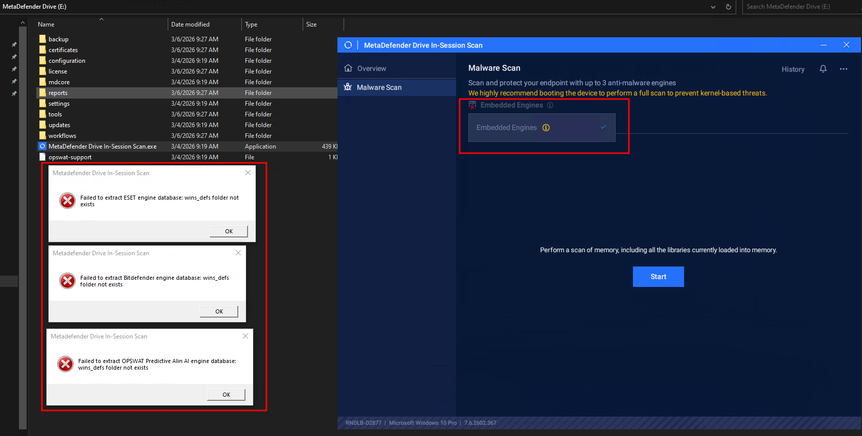 On a new or newly upgrade MetaDefender Drive, when running MetaDefender Drive In-Session Scan, there is no engines available with 3 errors