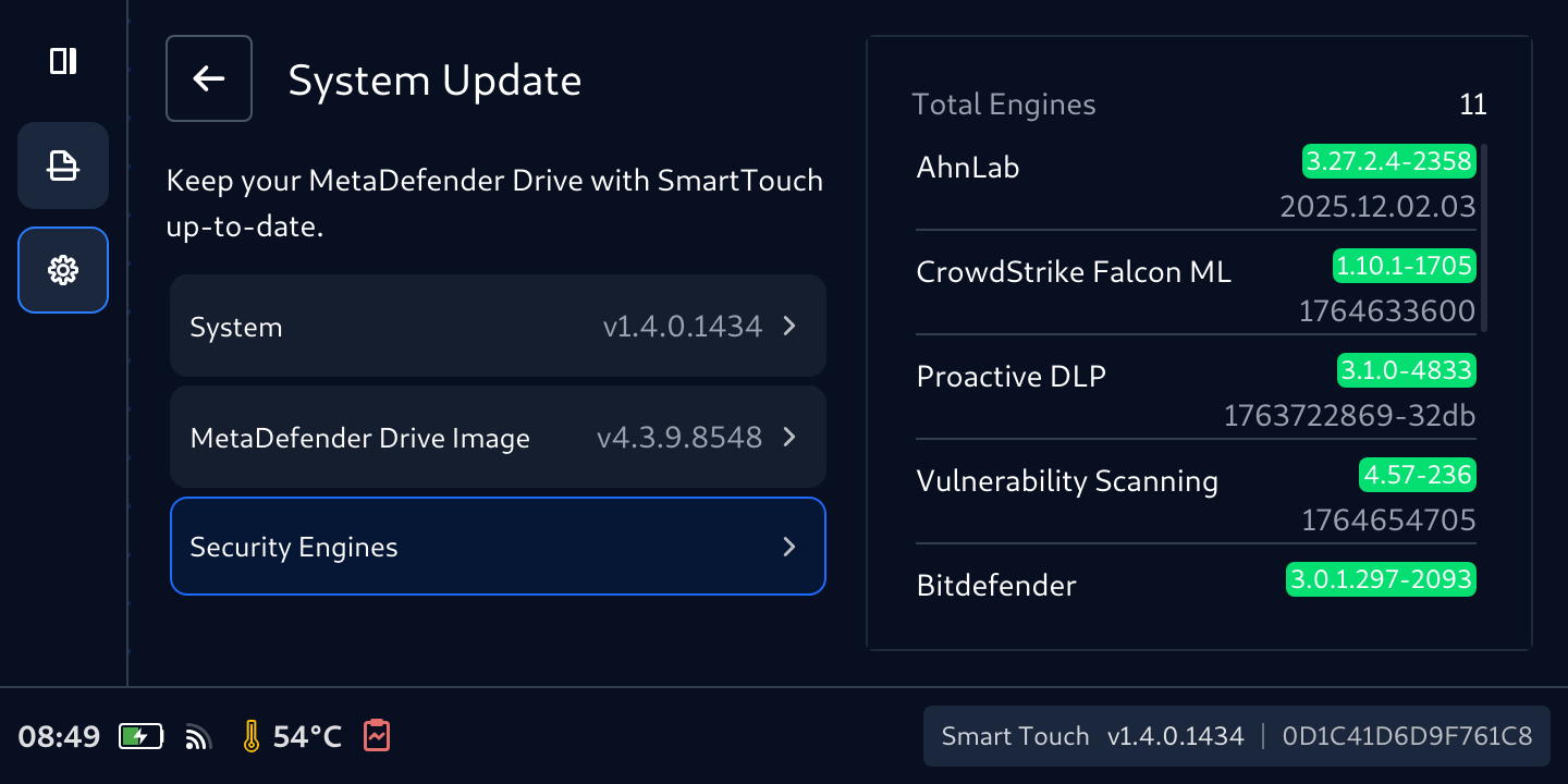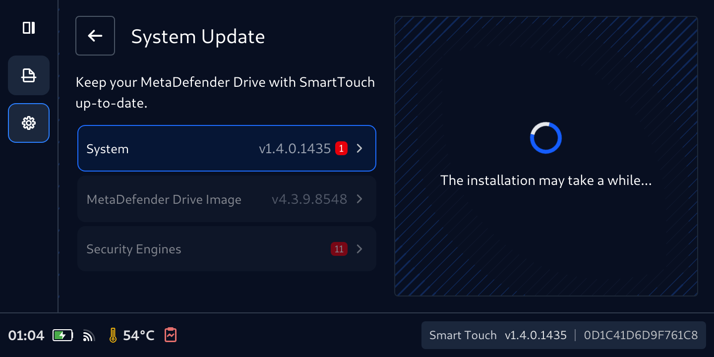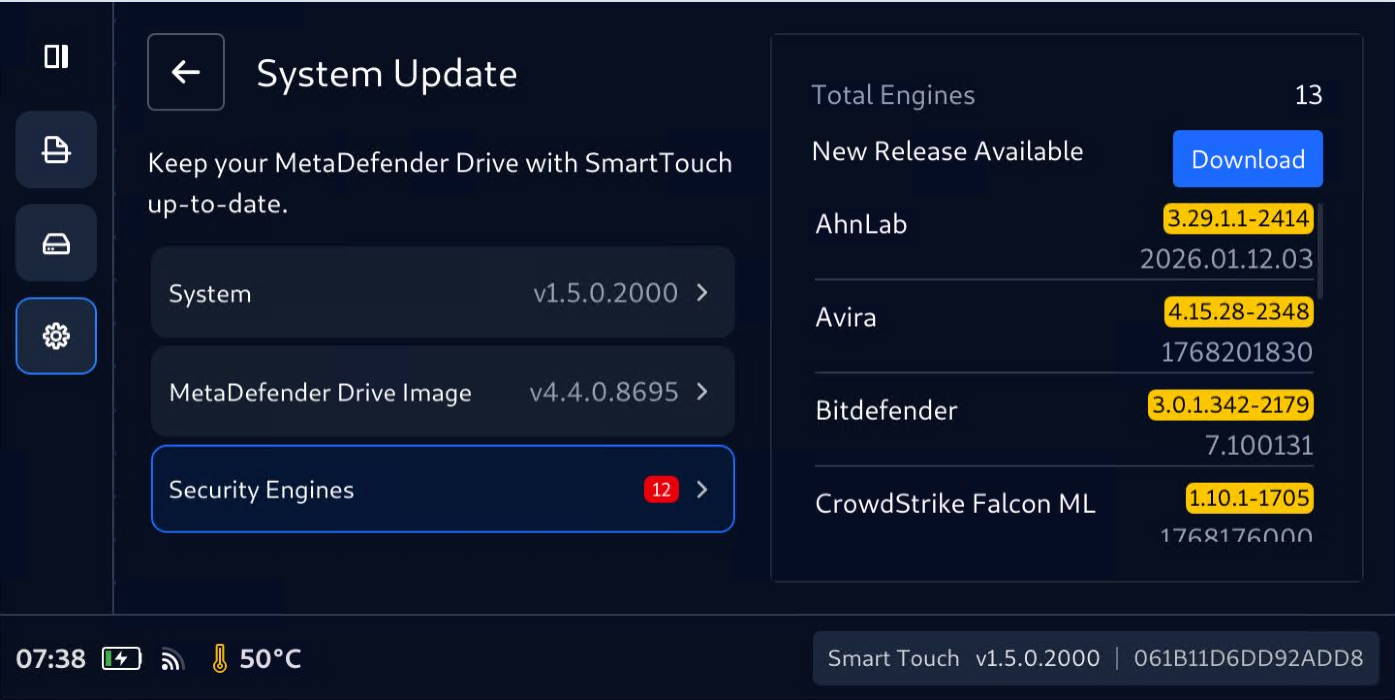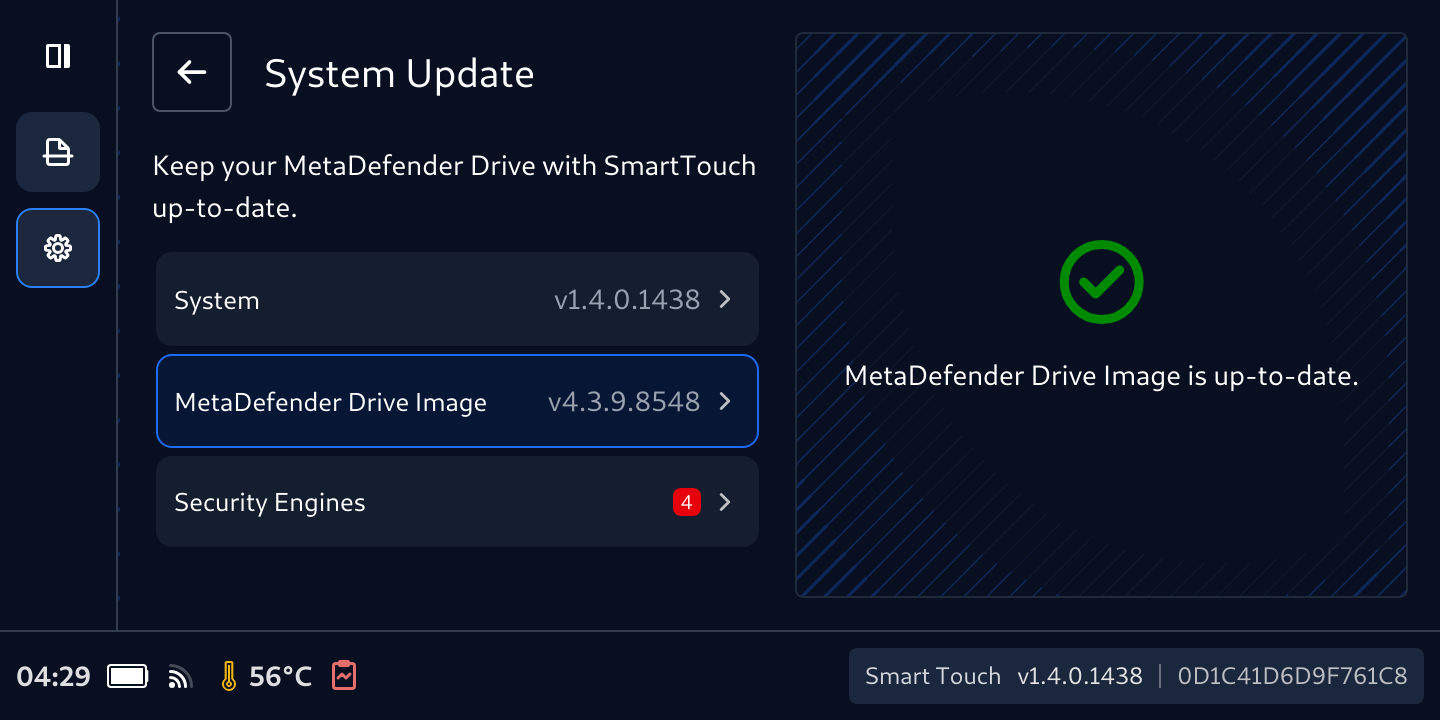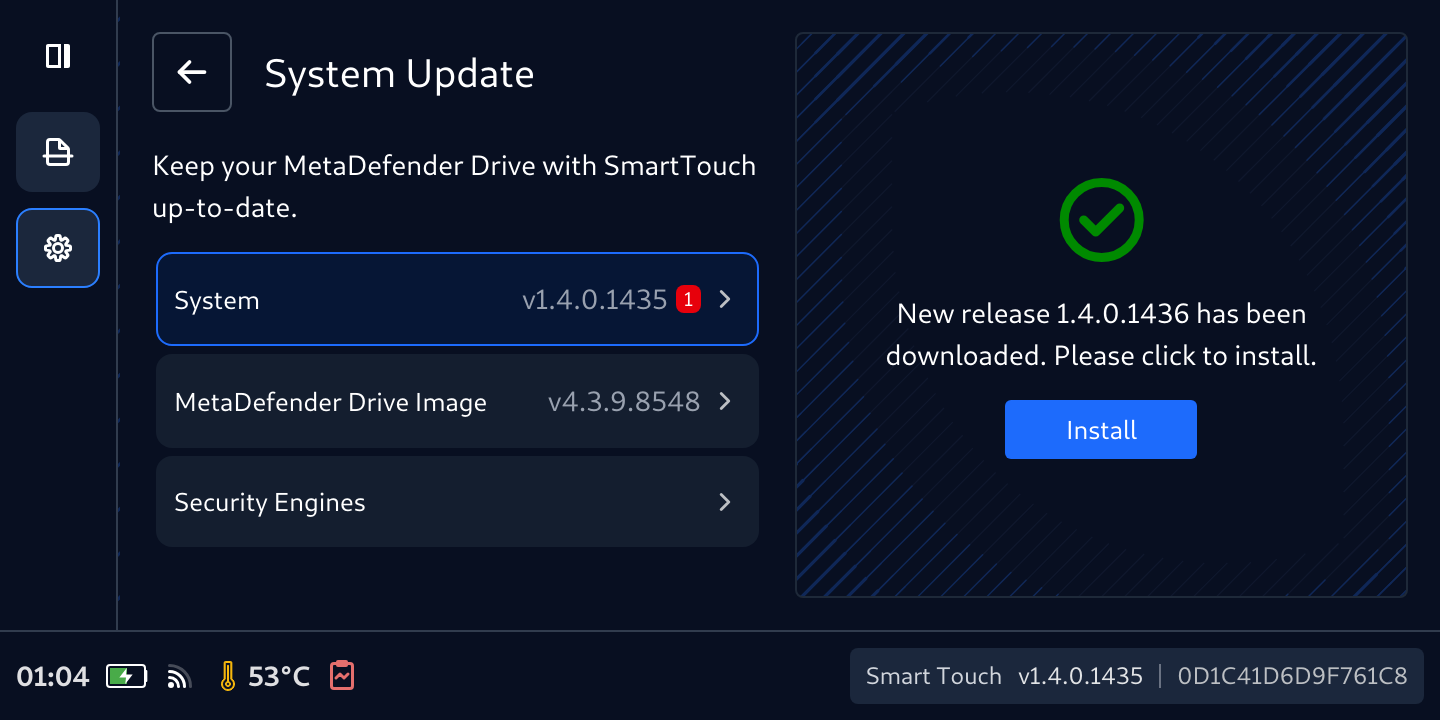 - Select System Update screen, noticing that there are updates available, tap System, MetaDefender Drive Image, or Engines, then tap Download or Install, and wait for the new version of the application to be downloaded.