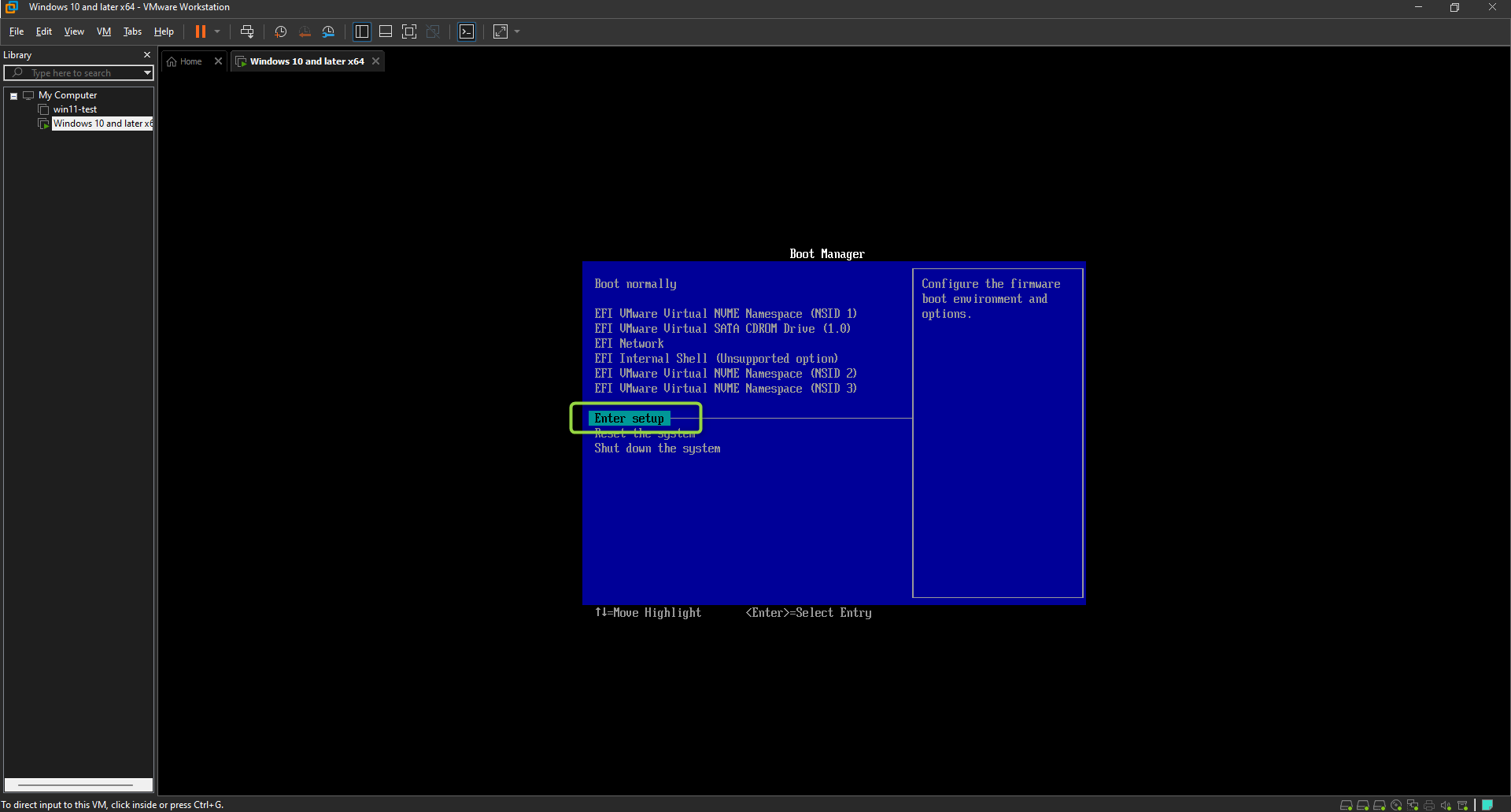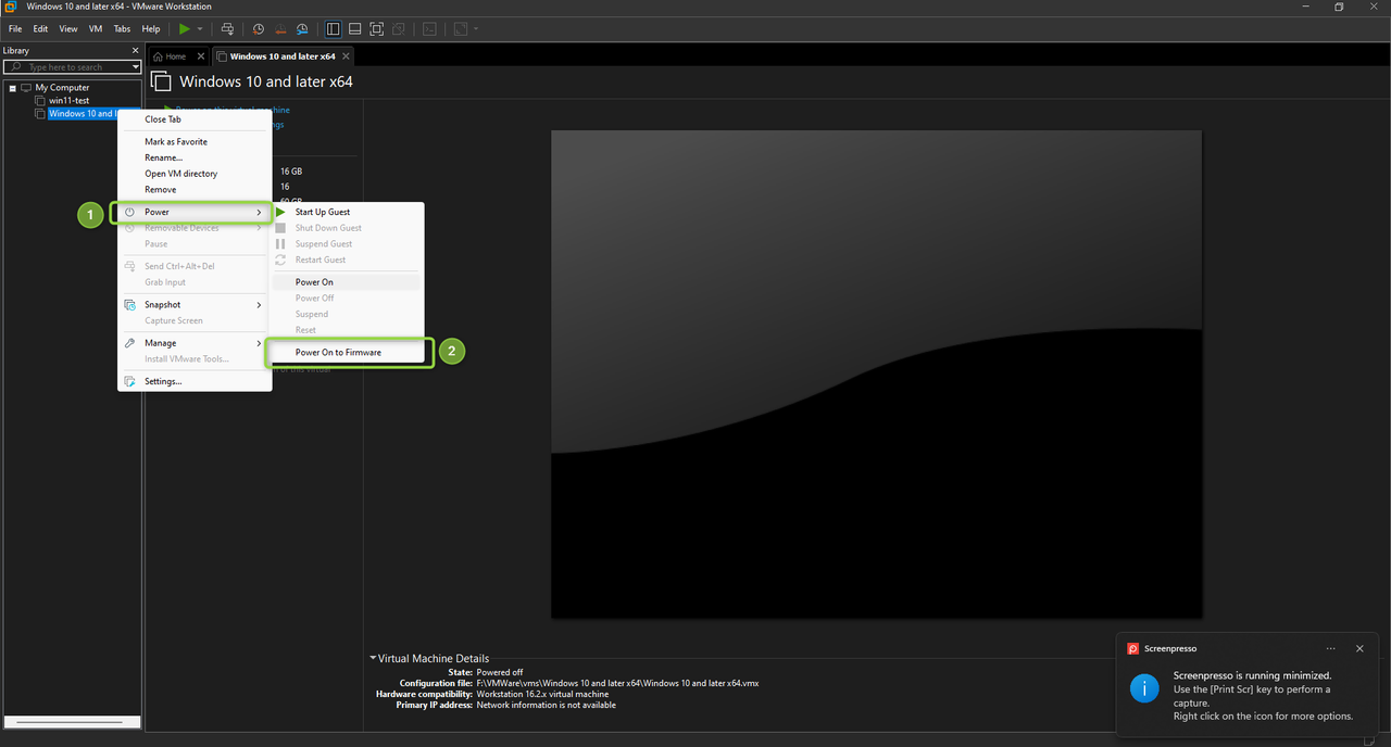- Power On your VM by right-clicking and selecting Power → Power On to Firmware.