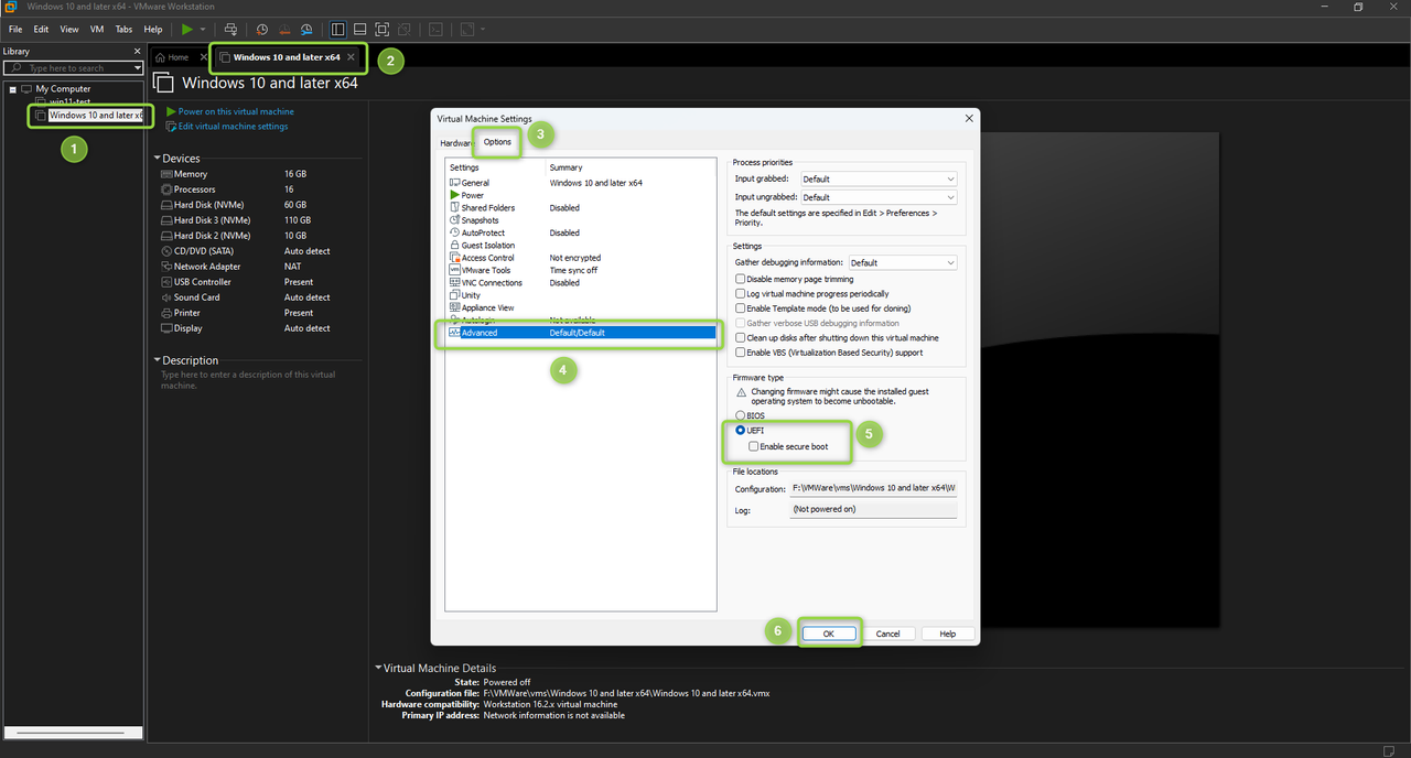 - To ensure your VMWare Workstation is ready to boot MetaDefender Drive, open the Settings of the virtual machine, and set the Firmware type to UEFI