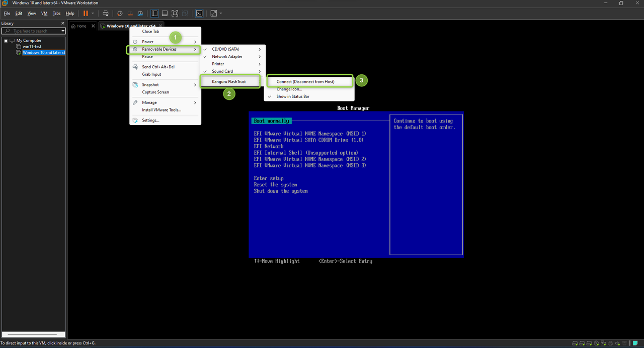 - Connect the MetaDefender Drive to the virtual machine by right-clicking and selecting Removable Devices → <the inserted MetaDefender Drive> → Connect (Disconnect from Host)