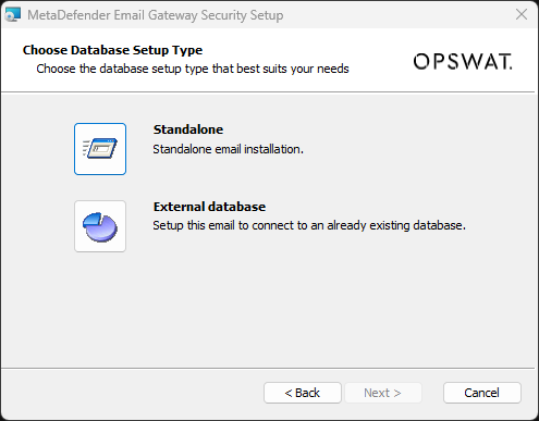 With the External database option, the installer will connect the Email Gateway Security instance to a pre-installed PostgreSQL server. This option is for scalable and highly available deployments. For details see Scalable deployment.