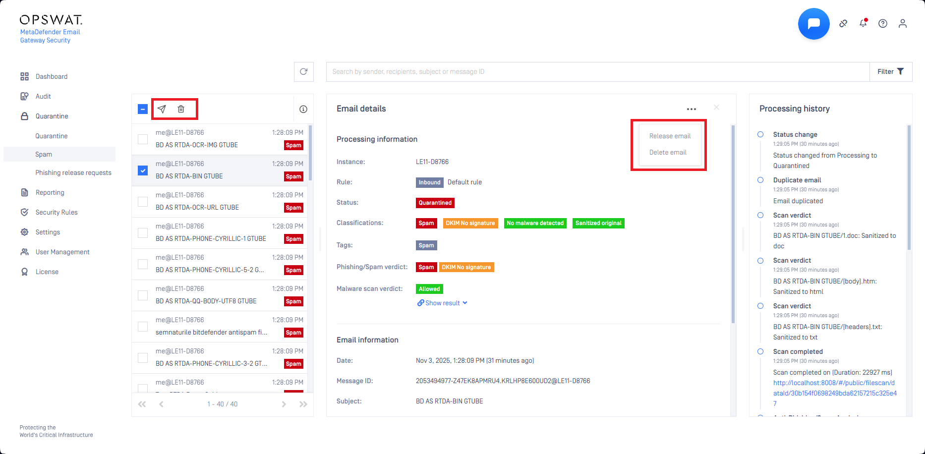 It is also possible to rescan an email using only the anti-malware technologies available in MetaDefender Email Gateway Security, omitting anti-spam & anti-phishing checks. This simplifies tasks, such as releasing a spam false positive while still ensuring that the email is free from malware. For details see Handling spam false positives.
