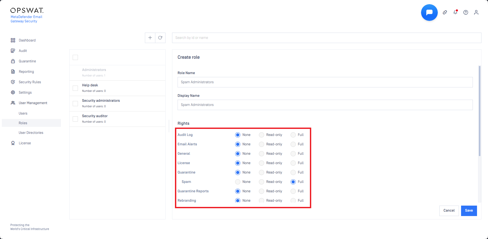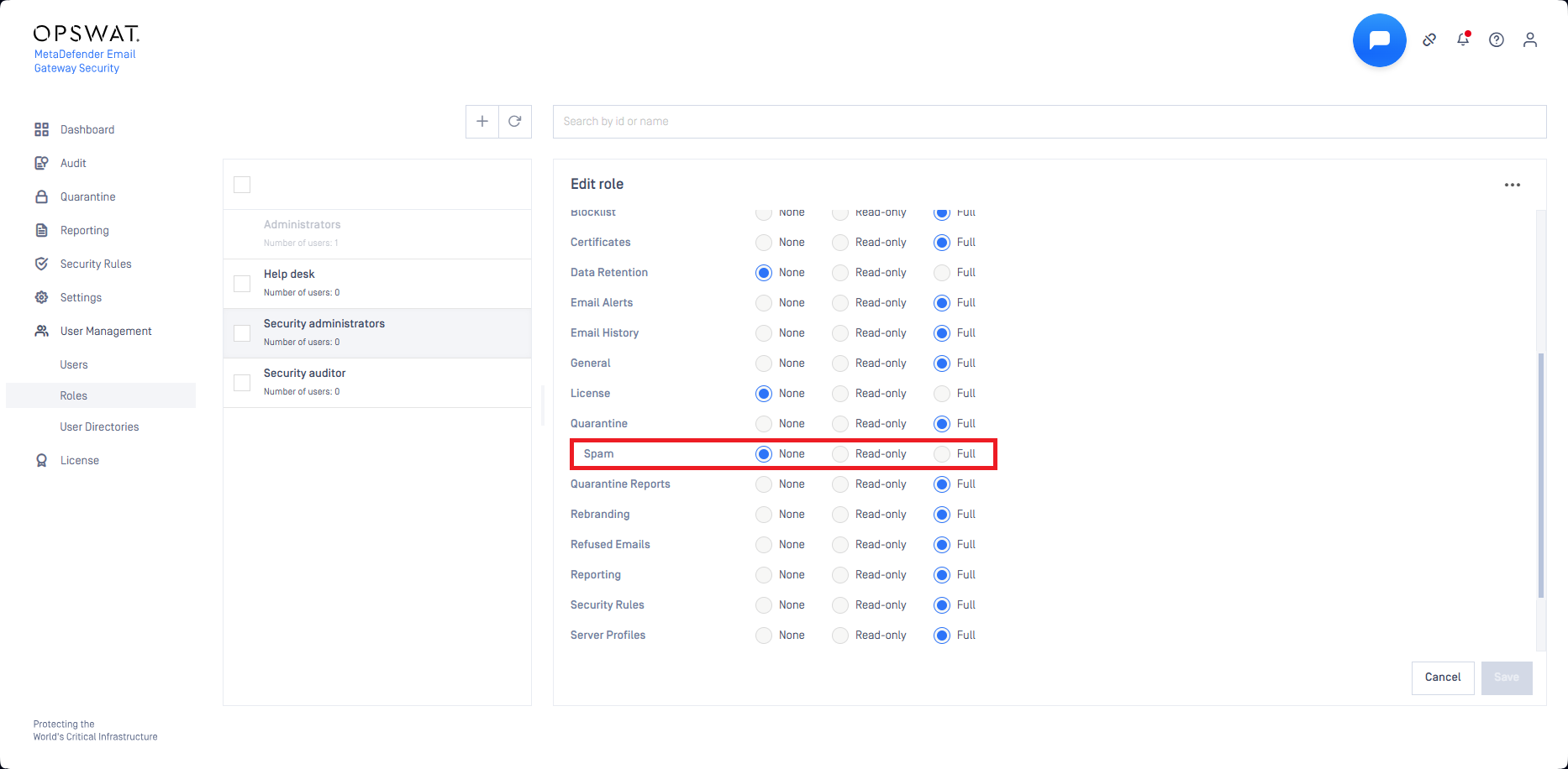 Access to global quarantine areas can be controlled under User Management > Roles. Whenever a new global quarantine area is created, an entry is added for it among the role permissions.