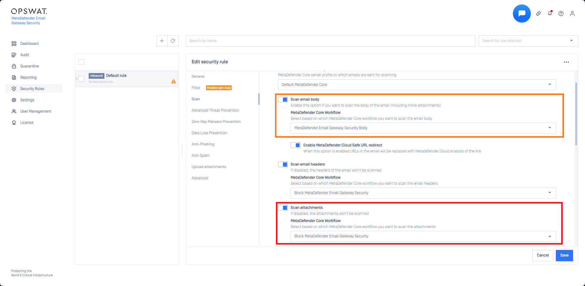 Inline attachments (attachments that display inline the HTML body; marked with Content-Disposition: inline;) were scanned with the Core side workflow selected for email attachments (marked with red below) and not with the workflow selected for the email bodies (marked with orange below).