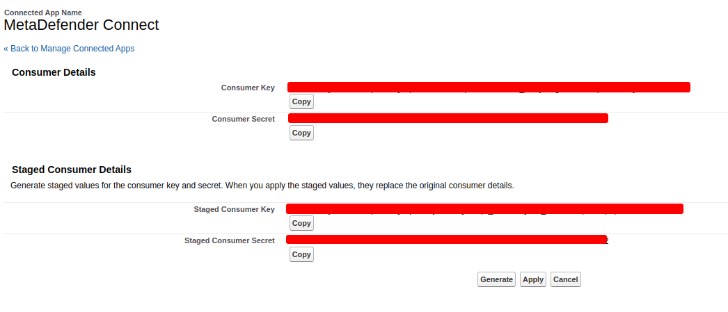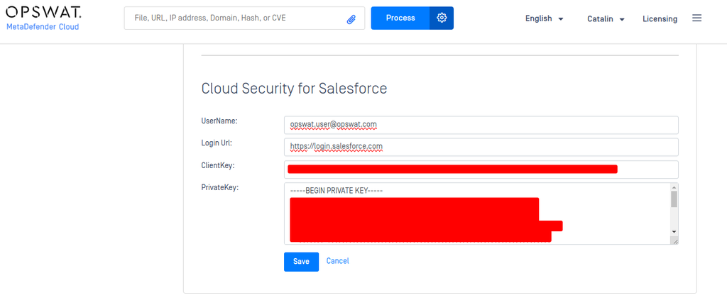 - Visit the security page:https://metadefender.opswat.com/account/security Find "MetaDefender for Salesforce” section.