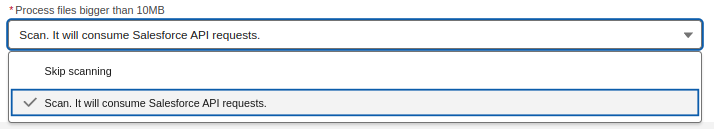 - To enable Large File Support, select scan option “Scan. It will consume Salesforce API requests.“ from “Process files bigger than 10MB” in the Policy Settings section.