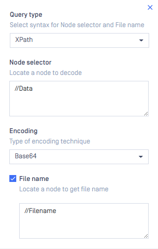 <s:Envelope xmlns:s="http://schemas.xmlsoap.org/soap/envelope/">    <s:Body>        <processBatch xmlns="http://example.com/batch/v1">            <BatchHeader>                <BatchID xmlns="">BATCH-DEMO-003</BatchID>                <Timestamp xmlns="">2025-10-27T14:10:00Z</Timestamp>                <Source xmlns="">DemoSystem</Source>            </BatchHeader>            <BatchItems>                <Item>                    <ItemID xmlns="">ITEM-A01</ItemID>                    <Document>                        <Filename xmlns="">doc1.txt</Filename>                        <Content>                            <Data xmlns="">U2hvcnQgZGVtbyBjb250ZW50Lg==</Data>                        </Content>                    </Document>                </Item>                <Item>                    <ItemID xmlns="">ITEM-EICAR</ItemID>                    <Document>                        <Filename xmlns="">test_eicar.com</Filename>                        <Content>                            <Data xmlns="">WDVPIVAlQEFQWzRcUFpYNTQoUF4pN0NDKTd9JEVJQ0FSLVNUQU5EQVJELUFOVElWSVJVUy1URVNULUZJTEUhJEgrSCo=</Data>                        </Content>                    </Document>                </Item>            </BatchItems>        </processBatch>    </s:Body></s:Envelope>To match the Base64 data content, users needed to configure the full node path as below: