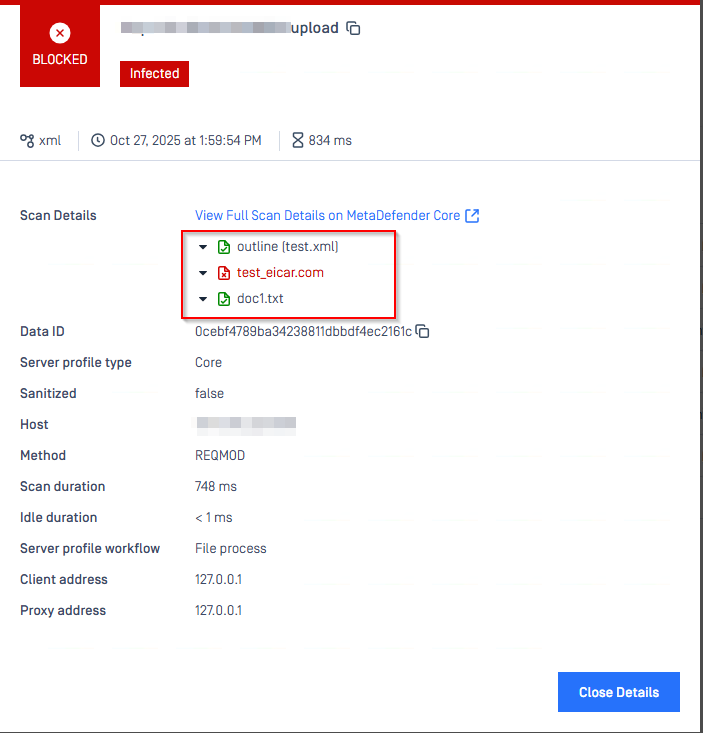 The Base64 data or attachments can then be sent to MetaDefender Core for scanning, further enhancing the ICAP and Core capabilities to detect and prevent malicious content. In the sample XML path, this allows the system to identify and block the EICAR test file contained within the XML structure.