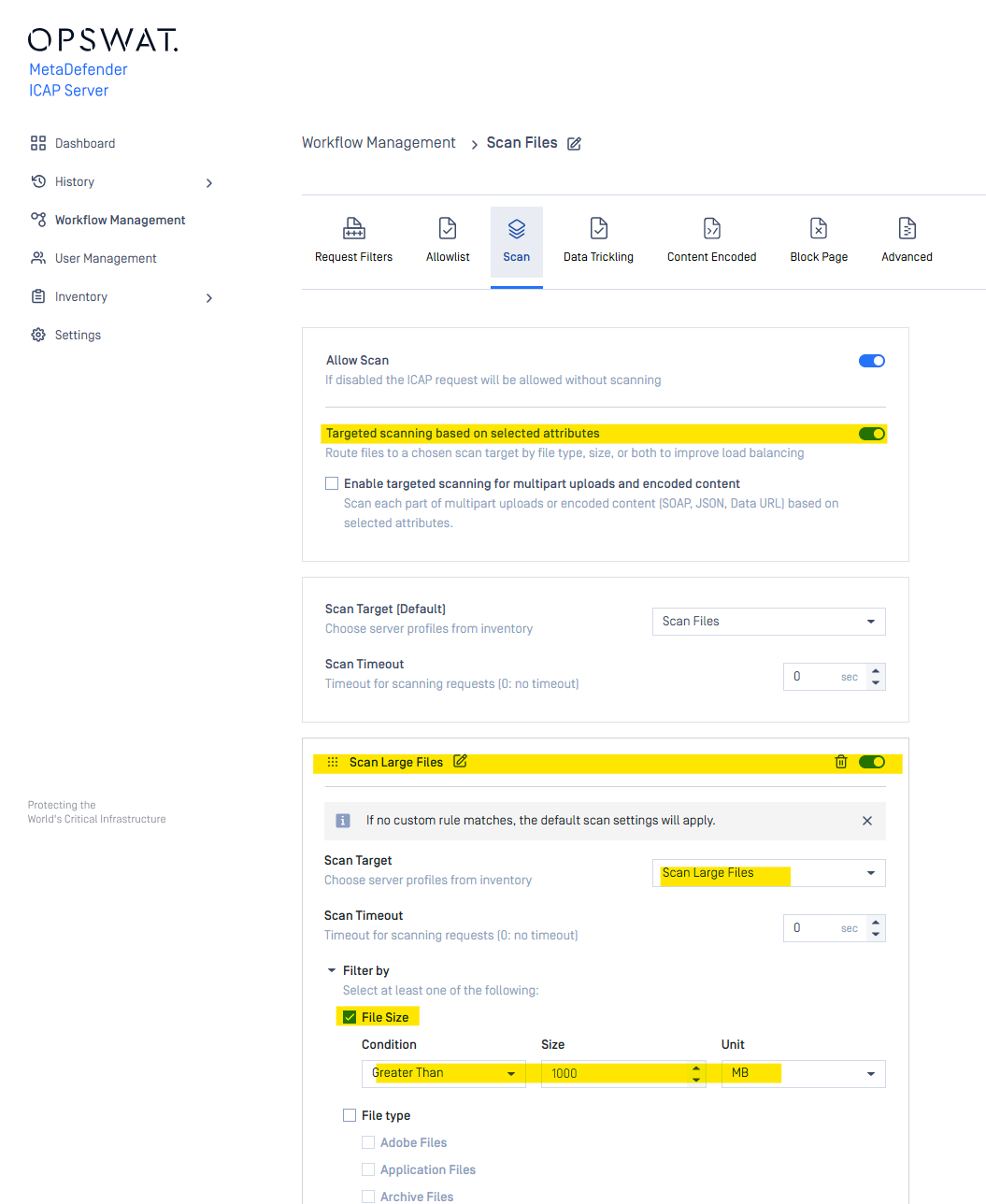 | Select MetaDefender Core Server Profiles Based on File Attributes | To prevent large files or files containing multiple objects from causing performance bottlenecks and affecting the system performance, users can now dedicate specific scan servers to handle such scan requests.