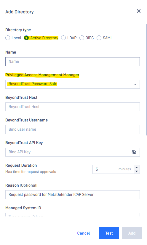 | integration with BeyondTrust's Password Safe | A new option to increase the security for Active Directory configuration. MetaDefender ICAP Server can be integrated with BeyondTrust's Password Safe (Privileged Access Management) for automated credential management. This enables automated credential management for secure access. See Integration with Privileged Access Management Manager ![]() |